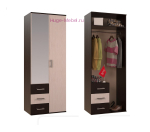 - Шкаф двустворчатый имеет 3 ящика, зеркальную дверь. Шкаф оснащен металлической перекладиной и полками для одежды.