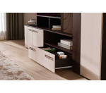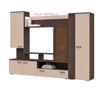 Недорогая стенка в гостиную с лаконичным современным дизайном и контрастной отделкой с фактурой дерева. Гостиная с платяным шкафом с выдвижной штангой и закрытым шкафом для книг или посуды.