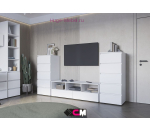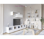 Белая тумба для телевизора с двумя выдвижными ящиками и открытыми полками. Выдвижные ящики на шариковых направляющих полного выдвижения. Тумбу можно дополнить настенной полкой, пеналами или шкафом.