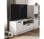Недорогая тумба для телевизора шириной 120 см белого цвета подходит для гостиной и спальни. Тумба с открытой нишей для мультимедийных устройств или книг, закрытой нишей слева и выдвижным ящиком шириной 76 см.