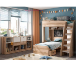 Кровать продается в комплекте с удобной лестницей, угловым шкафом и открытыми полками для хранения. Мебель для детской Киви с белыми матовыми фасадами подходит для мальчиков и девочек благодаря современному сочетанию цветов и рельефному рисунку в виде пазла на фасадах.