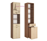 Недорогой шкаф пенал с выдвижными ящиками, открытыми и закрытыми полками. Пенал из серии мебели в детскую Орион выполнен в сдержанной цветовой гамме в сочетании с изображениями городов мира, нанесенными на фасады способом фотопечати.