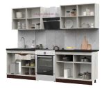 Готовая кухня Паола длиной 2 метра состоит из четырех метровых универсальных модулей: два нижних кухонных шкафа укомплектованы столешницей толщиной З8 мм и два верхних шкафа с распашными створками.