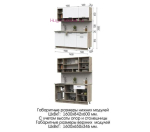 Нижний кухонный шкаф 1100 мм разделен перегородкой на две части: место под мойку и вместительную секцию с полкой для хранения продуктов или посуды. Нижний шкаф 500 мм с выдвижным ящиком на роликовых направляющих и нижним отсеком с полкой. Верхние модули представляют собой комбинацию из открытых и закрытых полок для посуды и специй.