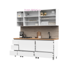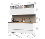 Недорогая кухня Хелен белого цвета длиной 2 метра представляет собой готовый к монтажу комплект кухонной мебели. В стоимость кухонного гарнитура входит цельная столешница "Дуб вотан" толщиной 38 мм. В комплект входят 6 кухонных шкафов, размеры  40, 80 и 80 см.