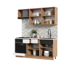 Готовый кухонный гарнитур шириной 1,8 метра продается в комплекте со столешницей. Кухня с фасадами МДФ с фрезеровкой и отделкой под дерево белого цвета со столешницей и корпусом золотистого цвета. Современная кухня состоит из шести кухонных шкафов и может быть дополнена пеналами, бутылочницей или другими модулями из этой же серии. Кухня полностью готова к установке, вся фурнитура и нижний цоколь в комплекте.