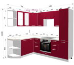 Современная угловая кухня бордового цвета с глянцевыми фасадами из МДФ. Недорогая угловая кухня с пеналом спроектирована под размеры типовых квартир. Обращаем внимание на то, что кухня может быть увеличена или уменьшена по вашему желанию.