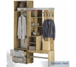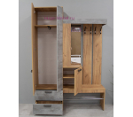 Недорогая прихожая Трамп для современного интерьера выполнена в необычном сочетании цветов с ярко выраженной фактурой дерева. Готовая прихожая подходит для небольшой квартиры и узкого коридора. Прихожая с платяным шкафом, вешалкой и удобной полкой для обуви оснащена выдвижными ящиками и небольшим зеркалом.