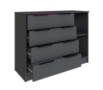 Длинный комод 1.2 метра с 4 выдвижными ящиками и одной створкой. Вместительный комод высотой 92 см в цвете графит серый с полностью закрытой системой хранения, за распашной дверцей одна полка. Комод входит в серию мебели Мадрид, подходит для любого помещения и сочетается со шкафами, тумбами, стеллажами в том же цвете. Комоды Мадрид выпускаются в нескольких цветах и размерах, оснащены современной фурнитурой с механизмом полного выдвижения.