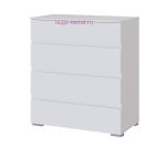 Недорогой белый комод с 4 выдвижными ящиками. Комод Плейона входит в серию мебели для спальни, но подходит и для одноименной гостиной и прихожей. Скошенные фасады заменяют ручки, направляющие ящиков роликовые. Корпус и фасад комода белого цвета с фактурой древесные поры.