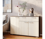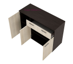 - модель состоит из трех секций: верхнего выдвижного ящика, левой части с распашной дверцей и нижней секции также с распашными дверцами и спрятанными за ними полками;