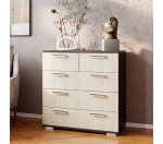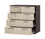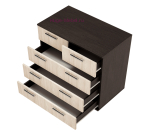 Практичный недорогой комод с лаконичным дизайном подходит для современного интерьера. Модель оборудована тремя большими и двумя ящиками меньшего размера. Оригинальность этой модели придает разделенный на две равные части верхний ящик.