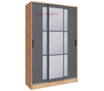 Шкаф-купе шириной 1.4 метра с тремя раздвижными дверями. Шкаф в сочетании серого цвета графит и золотистого дерева, фасады с зеркалами с фацетной обработкой. Внутри шкафа два отделения: отсек со штангой длиной 90 см и отделение с полками.