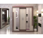 Недорогой шкаф купе с тремя отделениями: два отделения со штангами и центральное отделение с полками. Центральные дверцы распашные, боковые двери-купе (откатные). Изюминкой шкафа стало интересное решение зеркальных вставок на фасадах. Несмотря на невысокую стоимость, шкаф очень вместительный и имеет его общая длина 160 см, а высота 210 см.