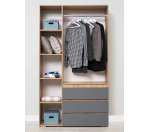 Недорогой трёхстворчатый шкаф Хелен ШК 06 с тремя выдвижными ящиками. Шкаф шириной 120 см в современном сочетании серого цвета и отделки под дерево. Внутри шкафа два отделения: двумя распашными створками неполной высоты, открывающиеся захватом снизу, хромированная штанга для одежды, внизу — три ящика полного выдвижения. Боковая секция шкафа с полками выполнена в виде глухого пенала и открывается с помощью отталкивателя.