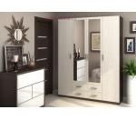 Недорогой распашной шкаф для прихожей или спальни. Шкаф с 4 дверцами и выдвижными ящиками вмещает большой гардероб. Шкафы Квадро изготавливаются в двух сочетаниях: венге/дуб и ясень светлый/темный. Несмотря на невысокую стоимость, шкаф отличается отличным качеством и продуманным наполнением. Внутри шкафа три отделения: центральное со штангой и два боковых с полками.