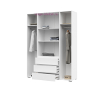 Вместительный 4-х створчатый шкаф с тремя выдвижными ящиками, ширина шкафа 160 см. Внутри шкафа 3 отсека: два отделения со штангой и отделение с полками. Выдвижные ящики на шариковых направляющих полного выдвижения. Шкаф входит в серию мебели Хелен и может быть дополнен пеналом, комодом или стеллажом в том же стиле. Мебель Хелен выпускается в двух цветах: полностью белом и сочетании белого и дуба крафт.