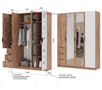 Вместительный четырехстворчатый шкаф шириной 160 см с двумя зеркальными створками и тремя выдвижными ящиками. Шкаф в сочетании теплого оттенка дерева крафт табачный со створкой белого цвета с геометричным рисунком. Внутри шкаф разделен на три отсека6 за центральными створками штанга для одежды шириной 76 см, слева 3 выдвижных ящика и 2 полки шириной 38,4 см, справыа отделение с 4 полками разной высоты. Шкаф Орегон вмещает достаточно обширный гардероб и сочетается с комодом, шкафами и пеналами из той же серии.